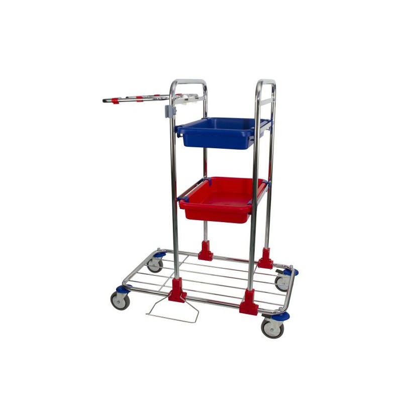 Materiaalwagen verchroomd frame met 4 wielen, afvalzakhouder, steelklem, mopframehouder en 2 trays, rood en blauw.