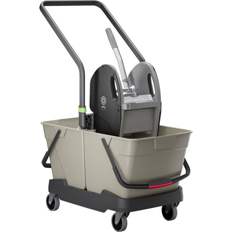 Met ergonomische duwbeugel. De emmers hebben een bredere opening aan bovenzijde voor makkelijke toegang van de mop.